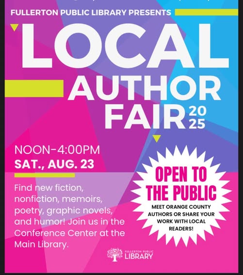 Fullerton Author Fair this Saturday, August 23, from noon to 4 p.m. Fullerton Public Library. 353 West Commonwealth Ave, Fullerton, California